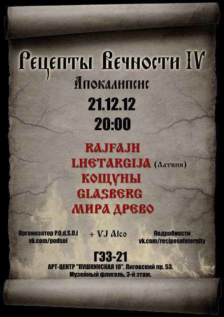 Pain Of Dark Shadow Of Insanity представляет Конец Света в рамках фестиваля Рецепты Вечности 4. Такое событие нельзя пропустить! Саунд Апокалипсиса представят проекты из России и гостья из Латвии. Вы услышите мрачный эмбиент, рёв гитар и невыносимый шум. Зловещую атмосферу дополнят видео проектов и VJ.